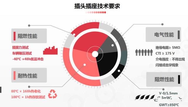 插座插頭的材料主要為PBT-GF25 FR/PBT-GF30 FR、PA66-GF25 FR/ PA66-GF30 FR和PA66-GF25 FR/PA66-GF30 FR (Free of halogen)。