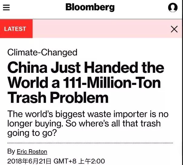 而美國媒體彭博社甚至在他們的報道中還使用了“中國給全世界丟下了一個1.11億噸垃圾的大問題”這種很明顯是在埋怨中國的標題。